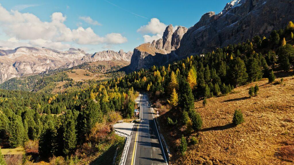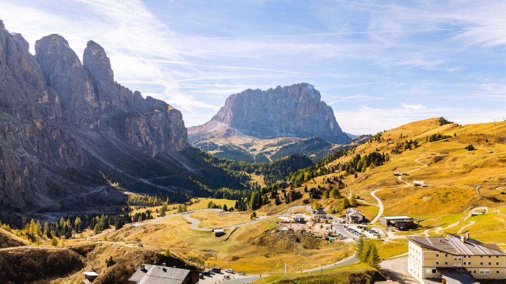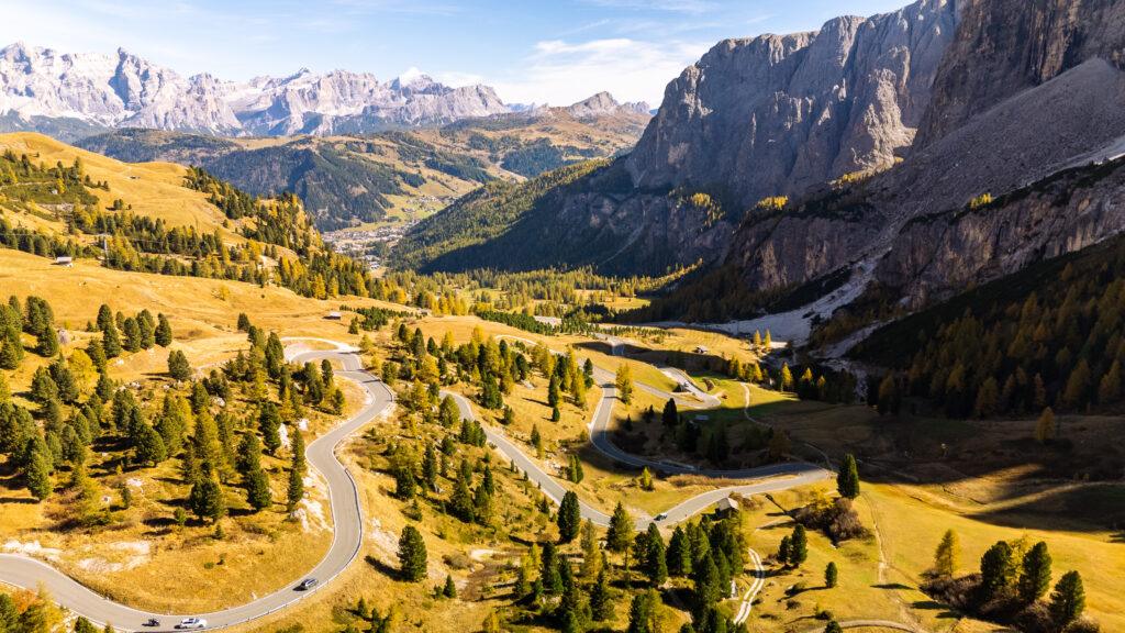 - • Die schönsten Dolomitenpässe in der bunt gefärbten Herbstlandschaft