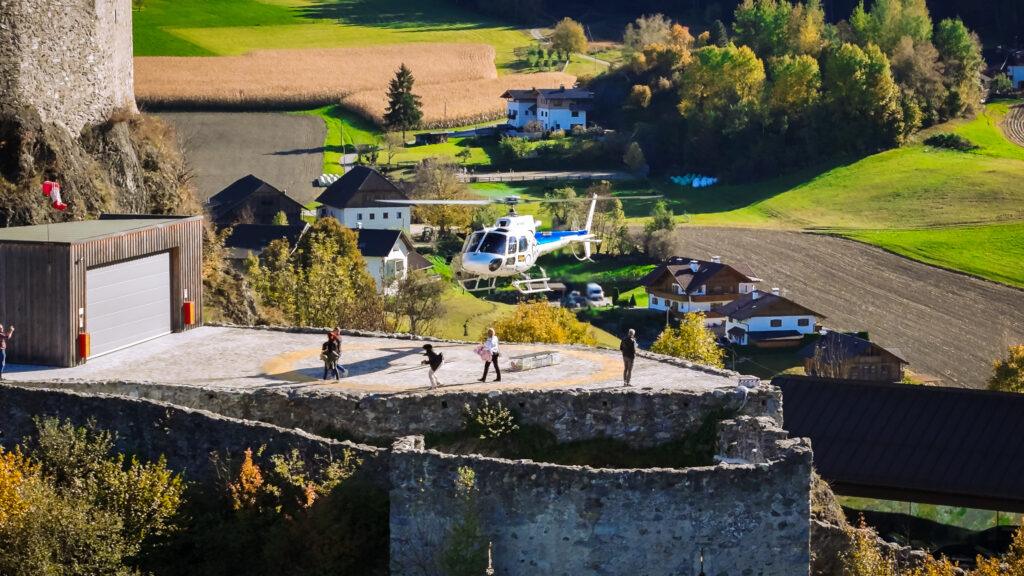 Am späten Vormittag beginnt das Kronplatz-Spektakel – ein Highlight, das in Erinnerung bleibt. Schon auf dem Parkplatz kündigt sich Besonderes an: Von hier starten wir zu einem exklusiven Helikopterflug* über die Bergmassive von Fanes, Sennes und Prags. Die Landung erfolgt auf 2.240 Metern Höhe, direkt am Kronplatz.