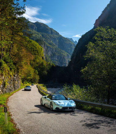 Von dort führt uns die Route noch einmal hinauf in die Berge – zum Passo San Boldo, einem echten Geheimtipp. Seine spektakuläre Südrampe gilt als technisches Meisterwerk: Über fünf in den Fels gesprengte Kehren-Tunnel und sechs filigrane Brücken schlängelt sich die Straße auf die Passhöhe – ein einzigartiges Erlebnis für jeden Fahrer und Beifahrer zugleich. Anschließend folgen wir dem Tal des Piave, dessen Flusslauf die Region prägt und genießen dabei Straßen, die mit ihren Schwüngen fast an die Toskana erinnern. Eine imposante Schlucht führt uns auf beeindruckende Weise zu unserem Mittagsstopp mit spektakulärem Blick auf die südlichen Ausläufer der Dolomiten.