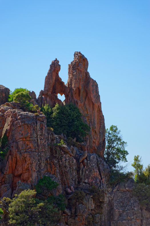 Heute wechseln wir die Perspektive: Statt Asphalt unter den Rädern erwartet uns das sanfte Schaukeln der Wellen. Direkt vom Hotel aus starten wir zu einer maritimen Entdeckungsreise – das Boot legt am hoteleigenen Steg ab und führt uns hinaus in den glitzernden Golf von Ajaccio. Vor uns entfaltet sich ein Anblick, der selbst auf Korsika seinesgleichen sucht: Die Calanques de Piana – leuchtend rote Felsen, die aus dem türkisblauen Meer emporragen, geformt von Wind, Wasser und Zeit. Diese Kulisse ist pure Magie – ein Naturschauspiel, das berührt und begeistert.