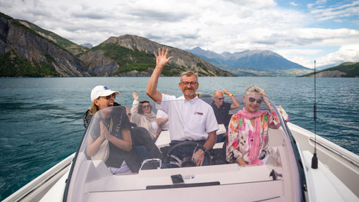 Am Nachmittag wechseln wir die Perspektive: Wir verlassen den Asphalt und begeben uns aufs Wasser. Bei einer Speedboot-Fahrt auf dem Lac de Serre-Ponçon erleben wir pure Energie – türkisblaues Wasser, Sonne, Wind und das Gefühl grenzenloser Freiheit. Wer den Mut hat, darf beim Zwischenstopp den Sprung ins kühle Nass wagen.